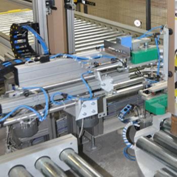 Questo dispositivo consiste in 1 magazzino verticale abbinato ad un organo di presa e di applicazione. L'estrazione degli angolare avviene tramite un sistema a ventosa dedicato. La successiva movimentazione del braccio è controllata da inverter. Appena dopo l'estrazione dell'angolare, l'unità di presa compie un movimento rettilineo di avvicinamento al pallet e quindi una rotazione con movimento sincronizzato della testa per mantenere l'angolare al corretto grado di inclinazione nei confronti dell'angolo positivo del pallet. L’organo di presa appoggia l’angolare di cartone sull’angolo del pallet; a questo punto un sistema di bloccaggio movimentato a pistoni con regolazione manuale a seconda del pallet blocca l’angolare con il pallet. L'avvolgitore automatico compirà 4 rotazioni di 90° ciascuna per terminare l’ inserimento dei 4 angolari. A questo punto inizia il ciclo di fasciatura.