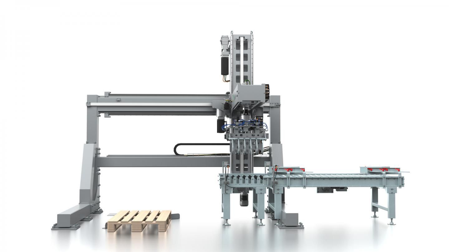 ZEUS è un robot pallettizatore a 4 assi composto da un monoblocco; è studiato per la pallettizzazione di scatole, fardeli, barattoli, sacchi, bobine e tutto ciò che può essere disposto su bancali.